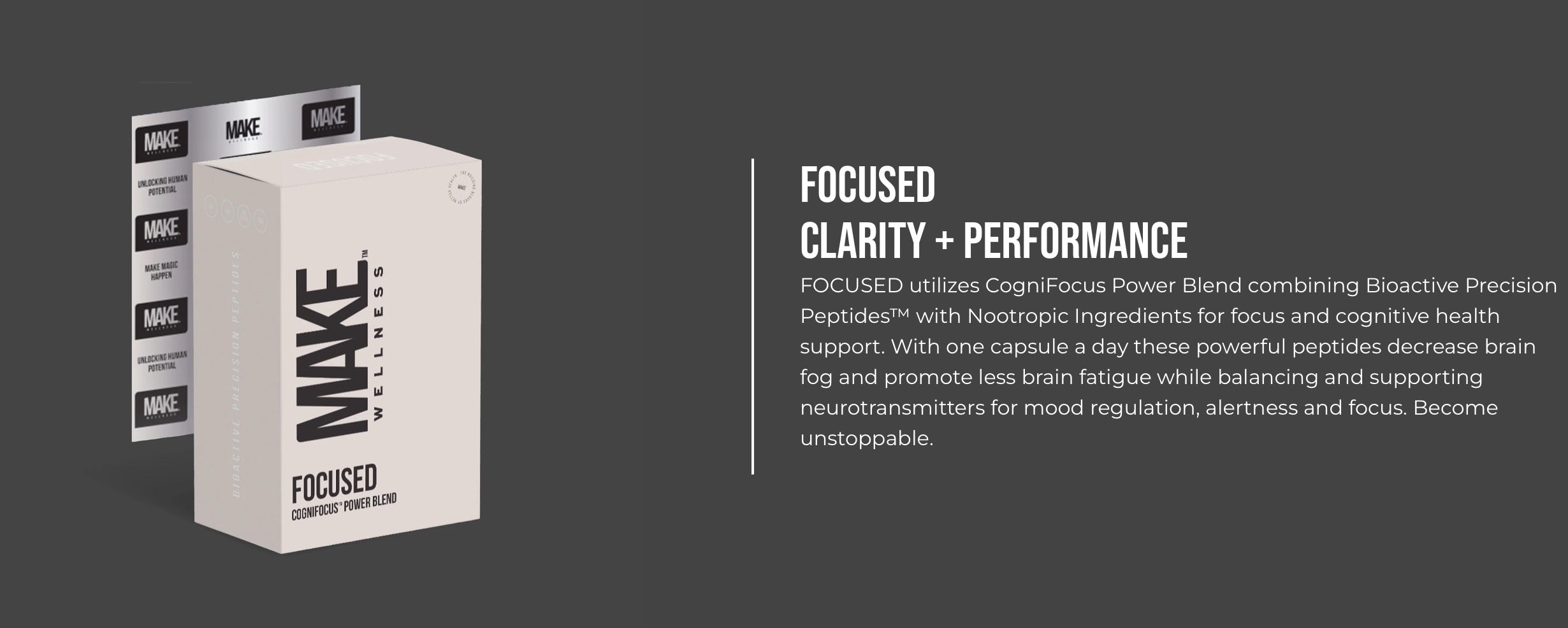FOCUSED is formulated to support cognitive function, improve memory, and protect brain health using a blend of bioactive peptides and nootropic ingredients.